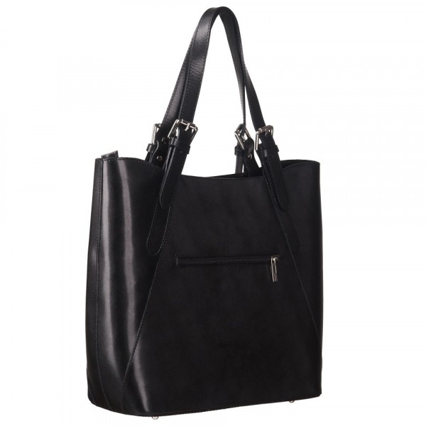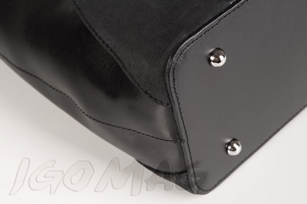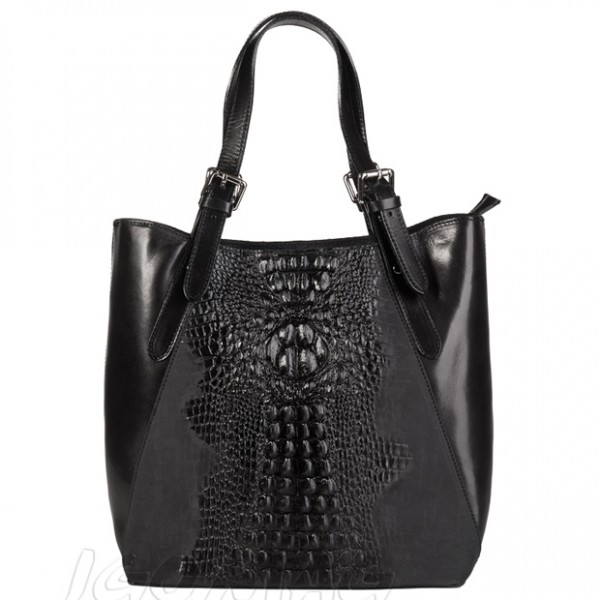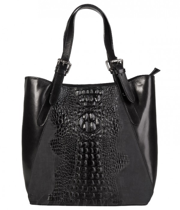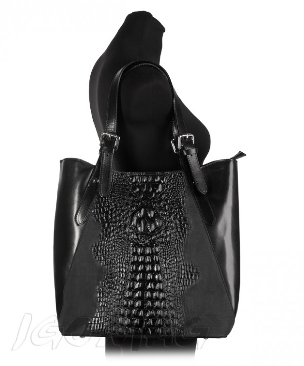 Włoska duża klasyczna torebka skórzana. Przód i tył torebki to połączenie naturalnego zamszu ze skórą lakierowaną o fakturze skóry krokodyla, natomiast boki są wykonane z gładkiej skóry licowej. Zamykana na zamek, wnętrze wykończone podszewką. Torebka posiada jedną komorę przedzieloną przegrodą na zamek. W środku znajduje się kieszonka na zamek oraz na telefon. Na spodzie cztery metalowe nity, zabezpieczające dno przed ścieraniem. Mieści format A4. Z tyłu kieszonka na suwak.